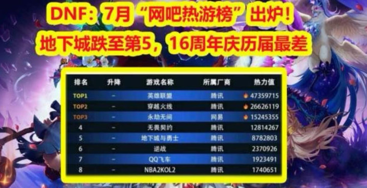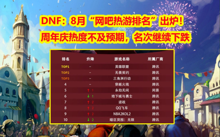 8月份顺网公布了:网吧热门网游排行榜单!要知道7~8月有DNF的周年庆,叠加暑假档期!如果是以往,地下城绝对能霸榜,最起码前三。但是今年不升反降,重新跌回第六。